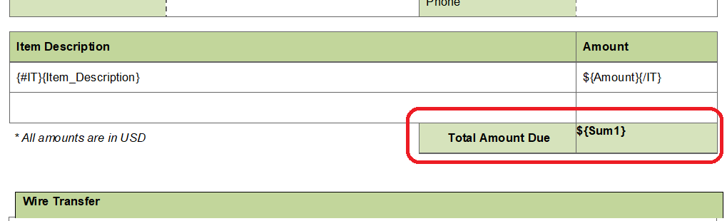 Perform the sum, multiplication, average, etc., of a set of values inline when the document is generated. For example, if you want to calculate the total invoice amount in an invoice table, add the sum to the table. The value would be computed at the time of generation.